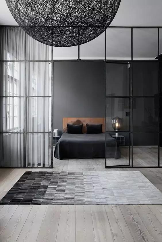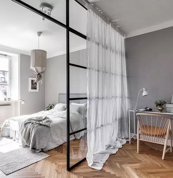 钛镁铝金的隔断门这两年非常火,黑色的铝金边框加上通透的玻璃,很好的做了阻断和通透空间的效果。用在卧室和客厅之间绝对不会出错,如果觉得太亮,在卧91视频污免费观看加一圈窗帘就可以很好的遮光啦!