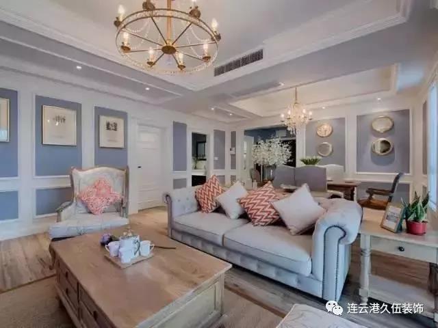 美式风格中,沙发背景墙设计手法更加多样,加以少量装饰线条与挂画,瞬间提气。