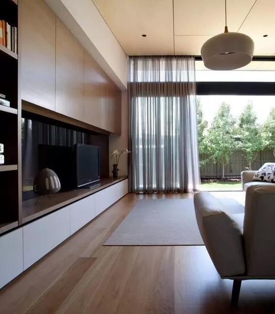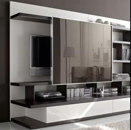 ▲可以做两扇大梭门,看电视时拉开两扇门,置物架就被自然遮挡;不看电视时,拉上门,露出置物架,墙壁也很干净整洁。