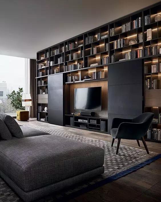 ▲电视背景墙设计成书架模样,书也有了地方安放,这样有文化气息的一面墙,会给人留下有知识的印象。