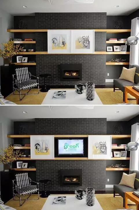 ▲有创意的电视背景墙设计就像变魔术一样,明明看着是两幅画,主人打开一看,电视机就在里面藏着。这样的开关设计像给电视套上了衣裳,再也不用担心它进灰尘了。